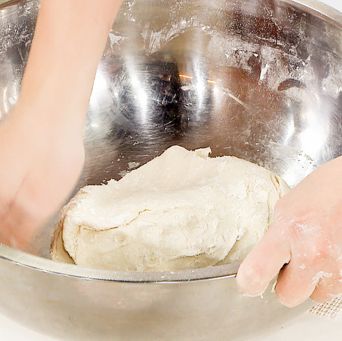 ∥ 將麵團擀平,並用叉子戳洞,成為披薩餅皮備用